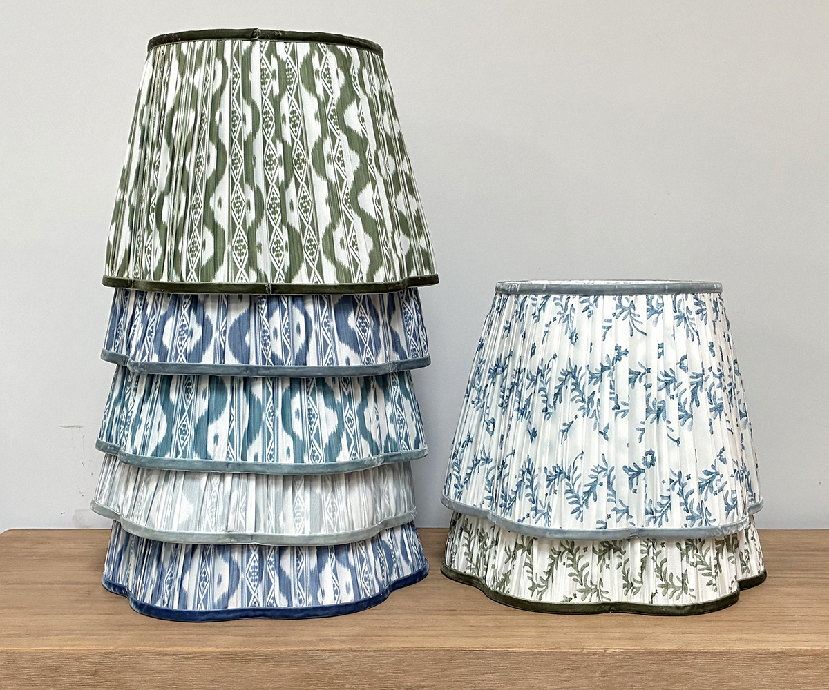 A gathered straight empire shade with delicate scalloped edge, shown here in our classical Ikat pattern in Sea with a complimentary velvet trim.