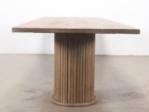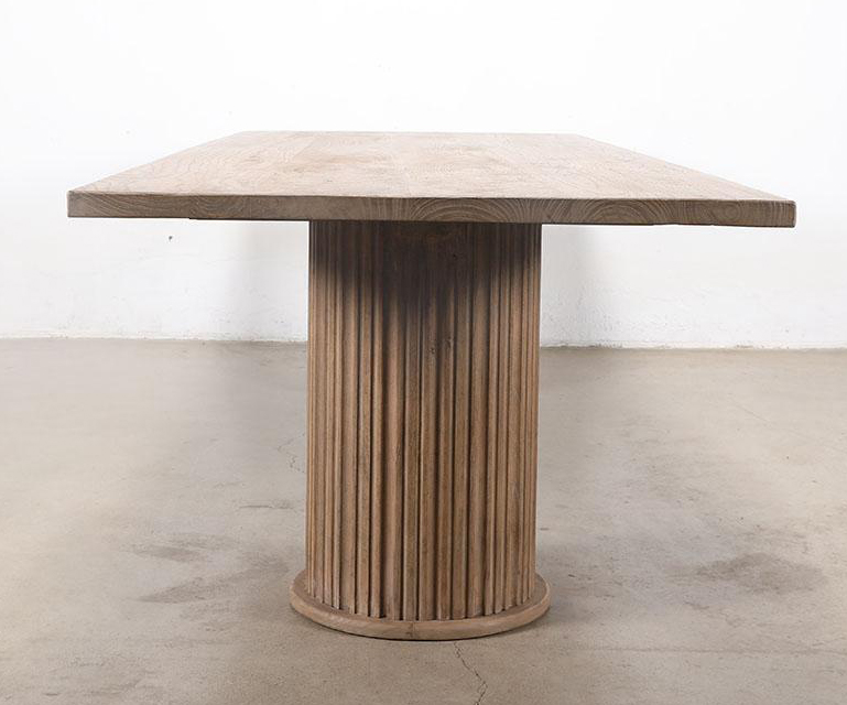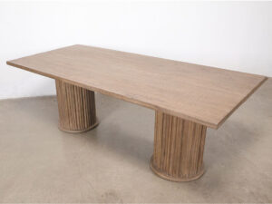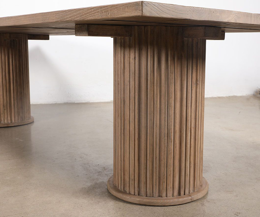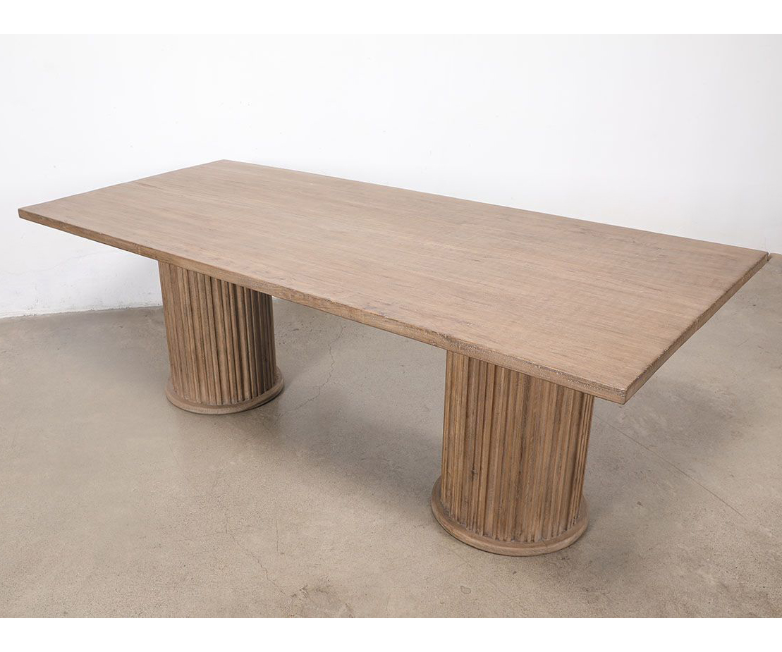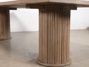 Finlay Solid oak Dining table comes with a minimalist, sculptural design. The tabletop is flat with clean, sharp edges and a natural, lightly weathered wood finish. It rests on two substantial cylindrical pedestal bases that feature vertical fluting, giving them a column-like, architectural appearance reminiscent of classical design.
