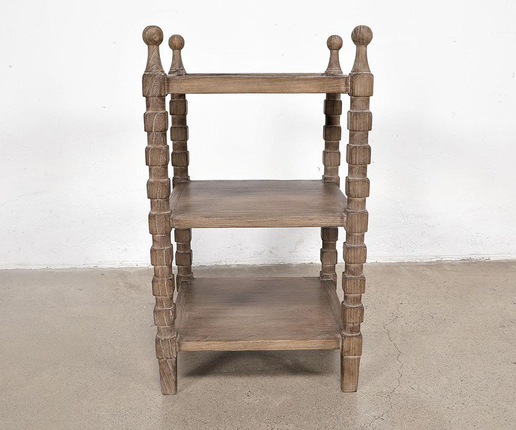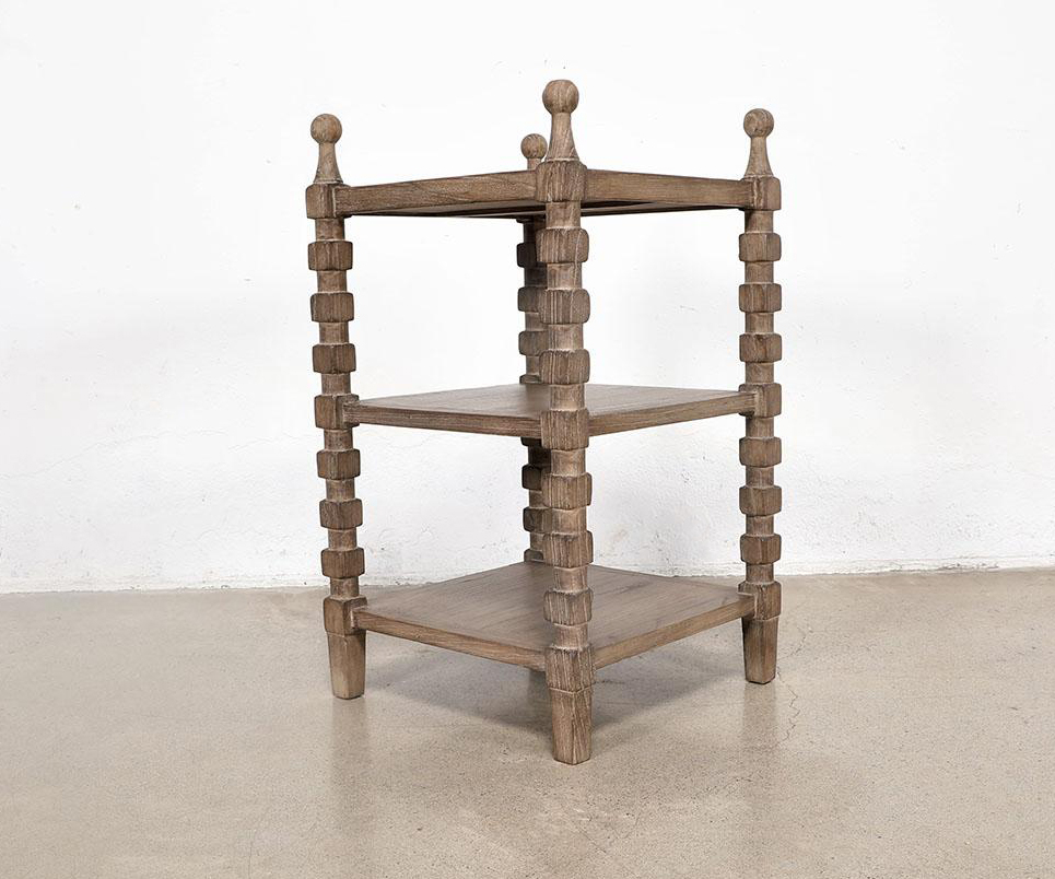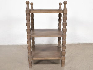 This striking three-tier wooden side table is a celebration of artistry and craftsmanship — a sculptural piece that transforms function into design. Its bold, carved legs, stacked with rhythmic geometric detailing and crowned with rounded finials, give it a distinctive architectural elegance. Each tier provides a stage for display or daily use, offering balance between structure and openness.