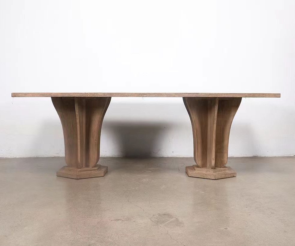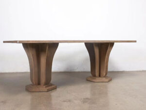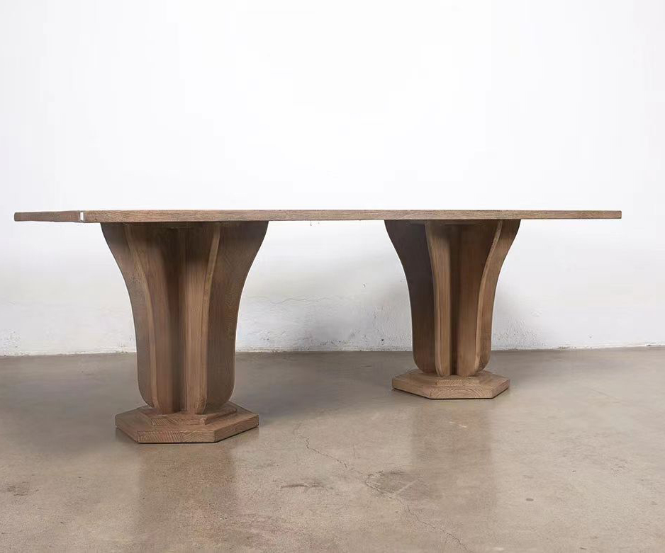 Marcus Solid oak Dining table distinguished by its sculptural pedestal bases and elegant craftsmanship. Each base features a curved, fluted form that tapers outward toward the bottom, resembling an inverted bell shape. The fluted and curved base design introduces a sense of movement and refinement, while the solid wood construction anchors the piece in timeless craftsmanship.