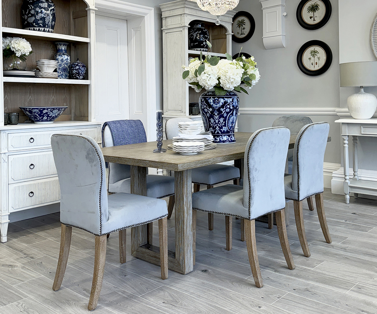 Our Newport Dining Table is made with Solid Oak and has an Engineered Oak Top to prevent cracking and movement once in your home. The solid chunky oak legs sit set inside the table, so you can seat a place setting at either end. Finished in a Medium oak with lime effect in the grain, the table has a hardwearing varnish so needs no further after care once installed in your home. No wood table likes tea, coffee or red wine spills, so do wipe the table down after use with a damp cloth.