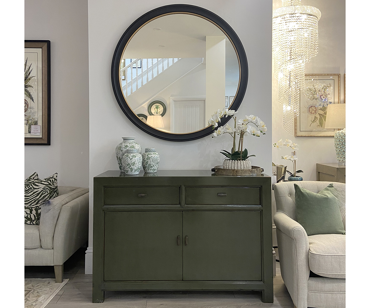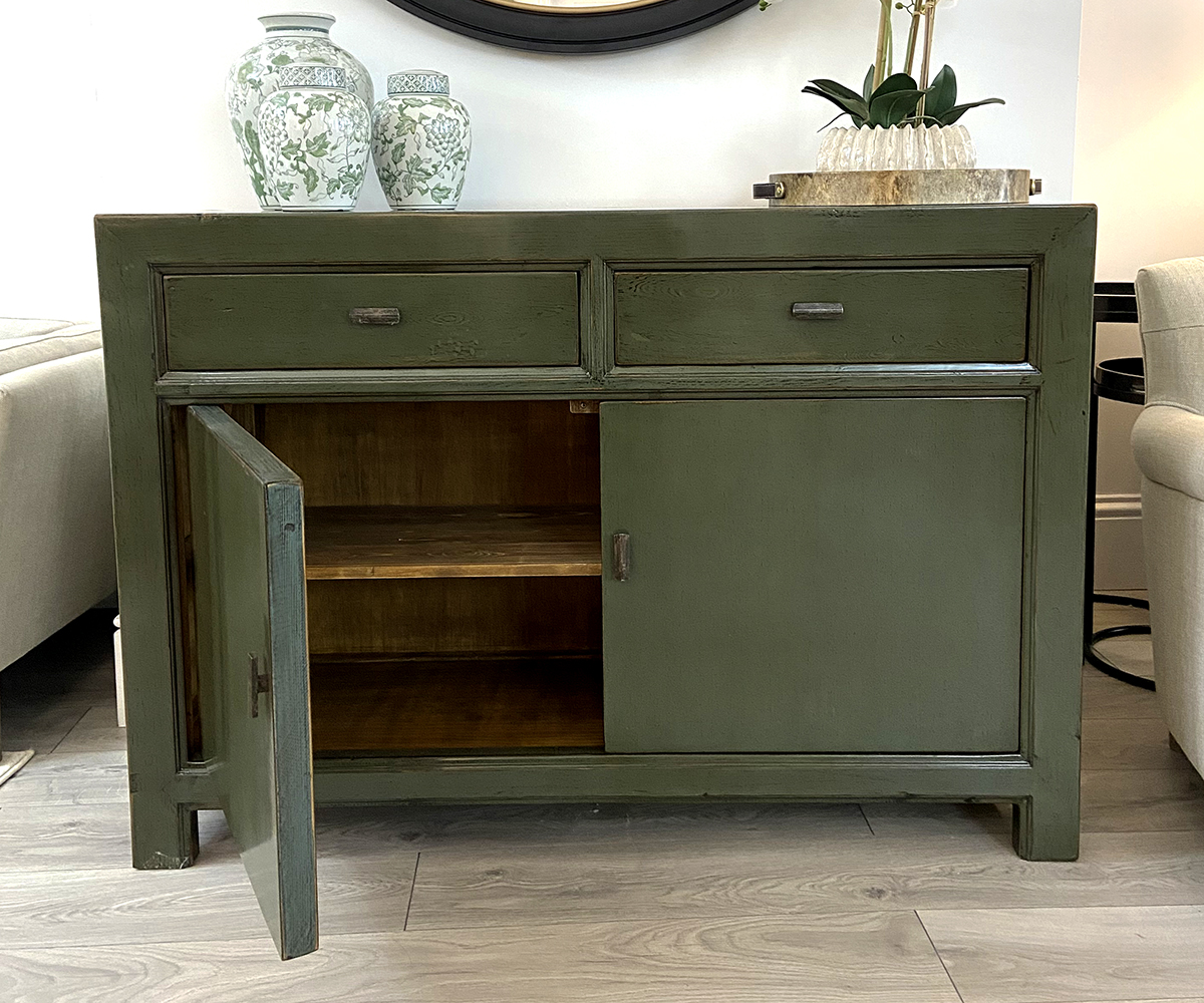 Available in Four colours—Grey, Moss,Indigo and Natural Light Oak—The Mei Sideboard is pictured here in the elegant Moss Lacquer finish. The protective gloss brings out the wood’s natural weathered grain while ensuring lasting quality.